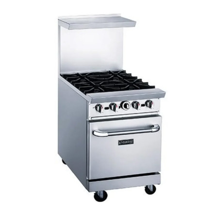 Estufa comercial de 4 quemadores con horno, diseñada en acero inoxidable con parrillas de hierro fundido. Potencia, eficiencia y durabilidad para cocinas industriales y restaurantes.