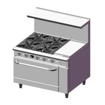 Estufa comercial con 4 quemadores, plancha grill y horno potente. Fabricada en acero inoxidable con parrillas de hierro fundido, ideal para restaurantes y cocinas industriales.