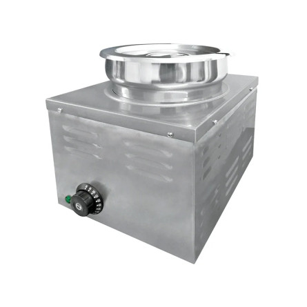 Despachador eléctrico de baño maría para mantener alimentos calientes como quesos, salsas y sopas, con capacidad de 4.5 litros y diseño eficiente en acero inoxidable.