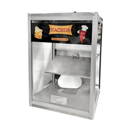 Exhibidor y calentador de nachos ideal para mantener productos calientes en negocios de comida rápida y eventos, con diseño eficiente en acero inoxidable y cristal.